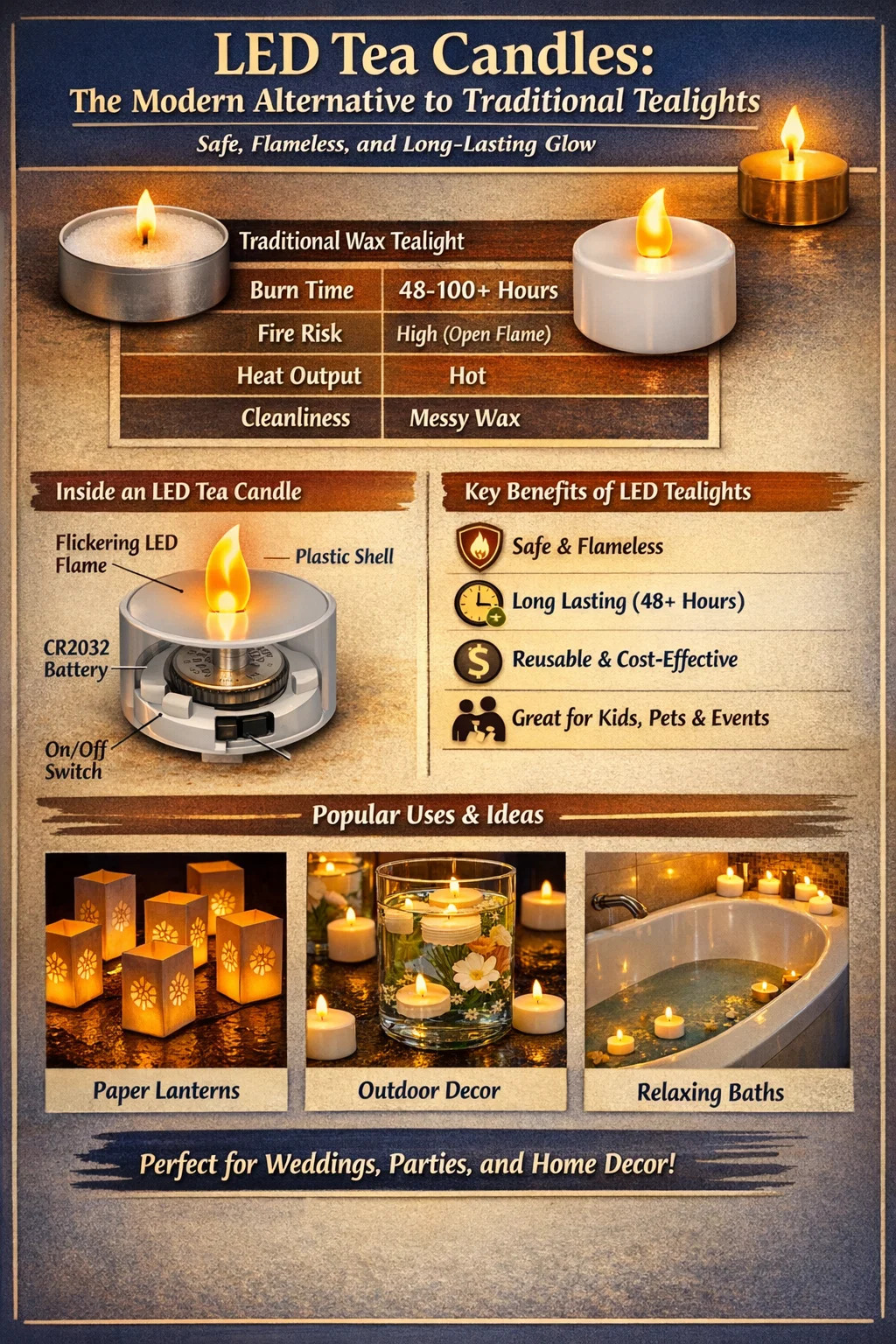 LED tea candles are small, battery-operated electronic lights designed to replicate the appearance and function of traditional paraffin wax tealights. They typically measure about 1.5 inches in diameter and 1.5 inches in height, fitting perfectly into standard votive holders, lanterns, and decorative jars. Unlike traditional candles that rely on a chemical combustion process to produce light, these devices use Light Emitting Diodes (LEDs) to create a warm, flickering glow without the risks associated with an open flame.