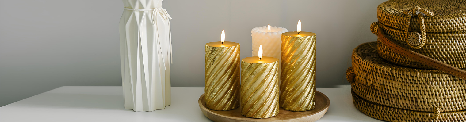 Create a warm, flickering glow without the worry of an open flame. Our battery-operated 3D wick  candles come with timers and remote control function and are designed for elegance and realism. Ideal for creating intimate settings in living rooms, bedrooms, or upscale events, they combine the charm of traditional candles with the safety and convenience of modern technology.